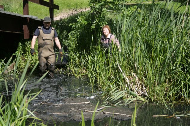 Phase 2 began in 2023, when we invited John Ford, the current Fife Biodiversity manager, to give a talk about the condition of the Lochty Burn and Stenton Pond at our meeting. We began clearing the wetlands at the east end of the pond to create a clear channel between the outlet from the main pond and the Lochty Burn. We decided to work at the wetlands first, leaving an area under the bridge blocked until the channel to the burn was fully clear. The work in the water could not be done during nesting periods.