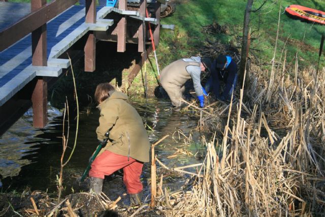 This work took longer than expected, as we found that using garden rakes could not cope with the level of vegetation in the pond. We purchased a water rake designed for work clearing silt and vegetation in ponds; however, we found it was still difficult to use, even with two adult volunteers pulling this rake. Our solution was to bring in a generator and a winch and attach them to the water rake, and this let us start clearing the vegetation from the wetlands. Some of the vegetation removed from the pond was able to be used by the Fife Golf Trust, who created a new wetland and pond at the Glenrothes golf course. When we could not continue working in the wetlands, we concentrated on clearing the bank and woodlands surrounding the pond. During 2024, only around half of the channel through the wetlands had been cleared, and the remaining part of the wetlands was left to be cleared the following year.